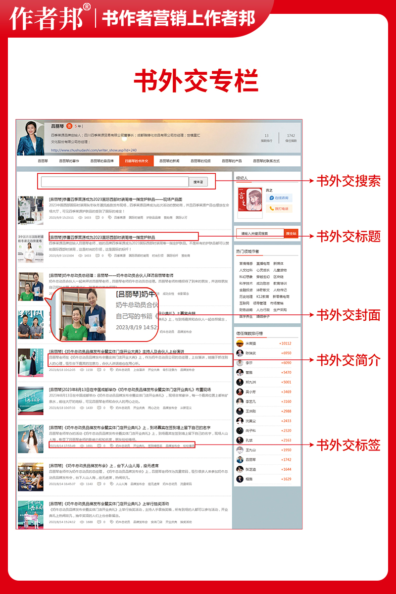 书籍做为一种传播载体,也是大众传播的一个重要方式,在互动性和跨文化交流方面发挥着重要作用。同时也通过互联网途径传播,结算处范围广、影响更大,并达到以书会友,以友促商的目的! 作者网站开通书籍作品、个人、企业、活动的外交专栏页面。可以自行或者经纪人团队为书作者收集、整理、上传、积累书作者外交活动照片,创造信任,积累信用,作者可以通过该栏目,展示、储存与广大读者、客户以及合作伙伴的活动信息,形成更多的交流与合作。外交内容可得到百度、360、搜狗、谷歌等各大搜索引擎平台的收录,开拓更广阔的市场。