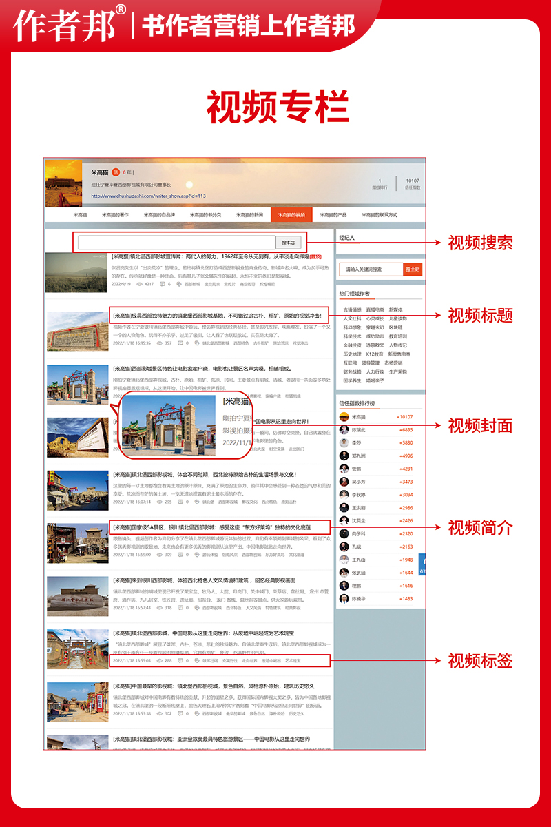 视频能够直观展示书作者个人、企业、作品、产品和品牌形象,可观性强,相对于文字、图片,视频冲击力更大。短视频时代的人群喜欢点赞、收藏、评论、转发,进一步加强了营销与被营销之间的互动性。 作者网站提供给书作者的视频收录、展示栏目页面。作者自行或者经纪人团队收集、整理、上传、积累书作者的个人视频啊、企业视频、活动视频、产品视频、课程视频、宣传视频、等,丰富书作者的品牌呈现模式。创造信任,积累信用,保存在作者网站这个数据信息储存的地方,能得到百度、360、搜狗、谷歌等各大搜索引擎平台收录,让书作者更立体、直观的展现个人品牌,以及企业实力。