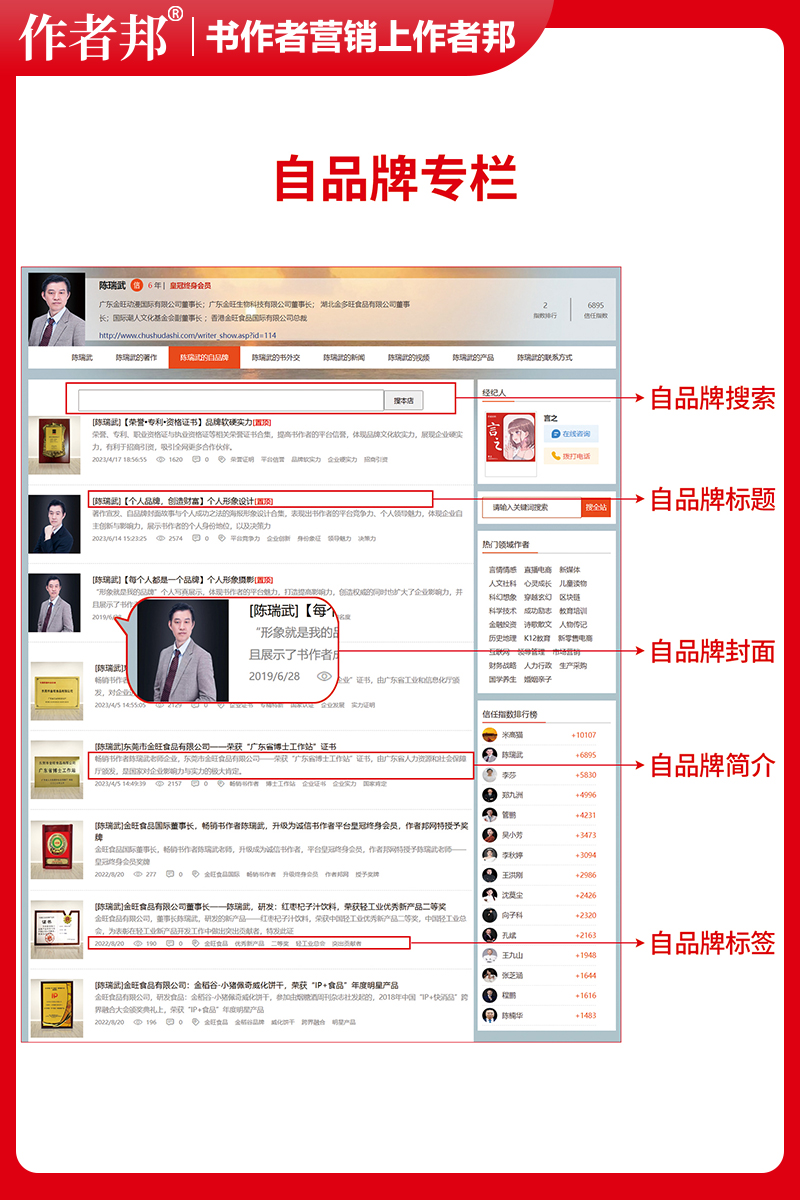 自品牌就是个人品牌、个人IP,个人品牌就是个人的护城河!如何能够在人群中脱颖而出,需要展示个人品牌的实力。作者通过作者网站打造个人品牌,塑造影响力,以及自身的软实力。 作者网站开通自品牌专栏,可以自行或者通过经纪人团队收集、整理、上传、积累作者个人和企业荣誉资质,作者形象精修照片、作者宣传海报等;收集信息,积累信用。并且内容可以得到百度、360、搜狗、谷歌等各大搜索引擎平台收录,体现自身影响力、文化软实力、企业硬实力。