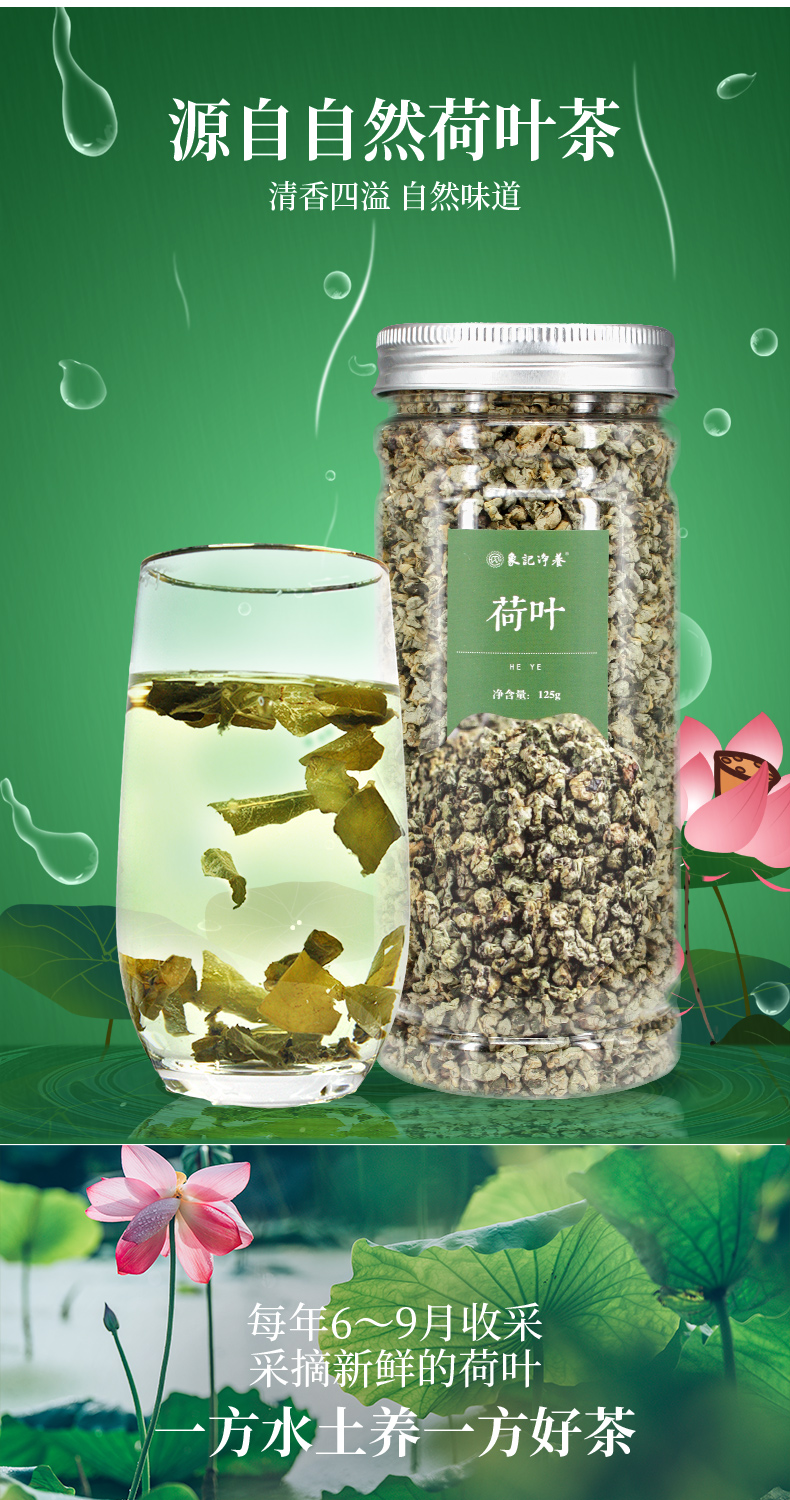 象记干荷叶——正品荷叶茶,源自自然荷叶茶,清香四溢,自然味道,每年6—9月收采,采摘新鲜荷叶,一方水土养一方好茶,一杯荷叶茶,畅通身心,色泽自然,清爽身心。