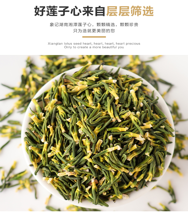 象记精选,每一颗莲子心都来自湖南湘潭,纯手工采摘,颗颗精选,当季新品,新鲜营养。自然阳光晾晒,无任何添加剂,在保证营养的同时保证品质,茶汤翠绿色泽,幽幽清香,醇而鲜美。
