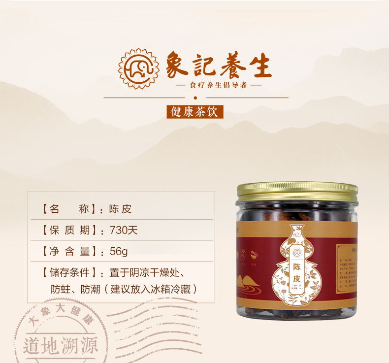 象记净养——道地广东新会老陈皮,药食同源,道地溯源,源于新会老陈皮,养生茶饮,天然药材,自然味道,好喝健康,手工采摘,自然晾晒,好味道源于好材料,安心放心。