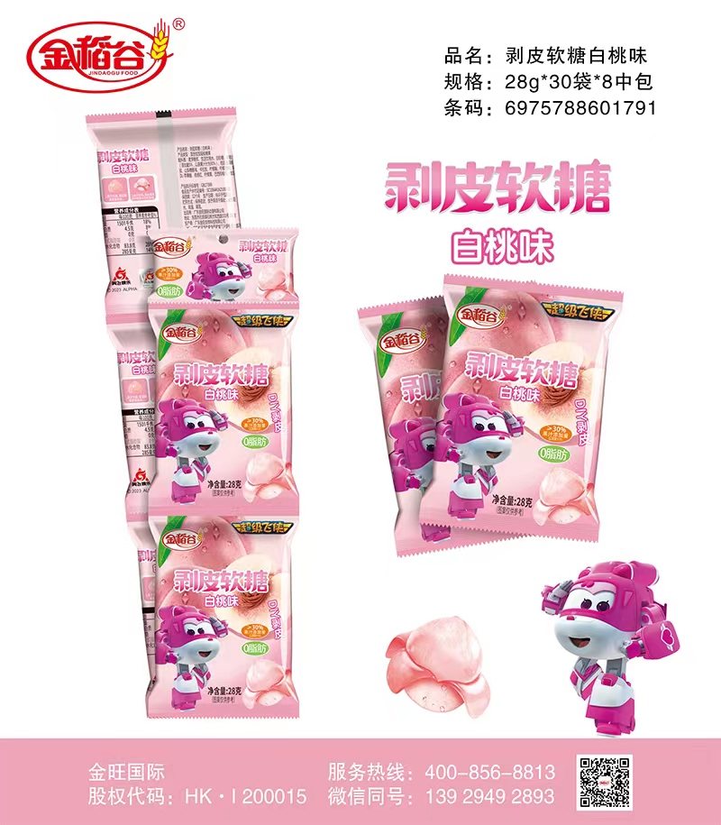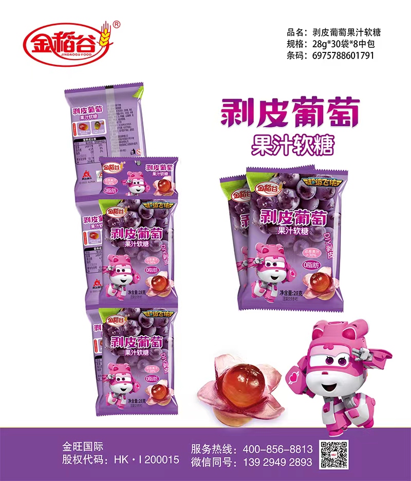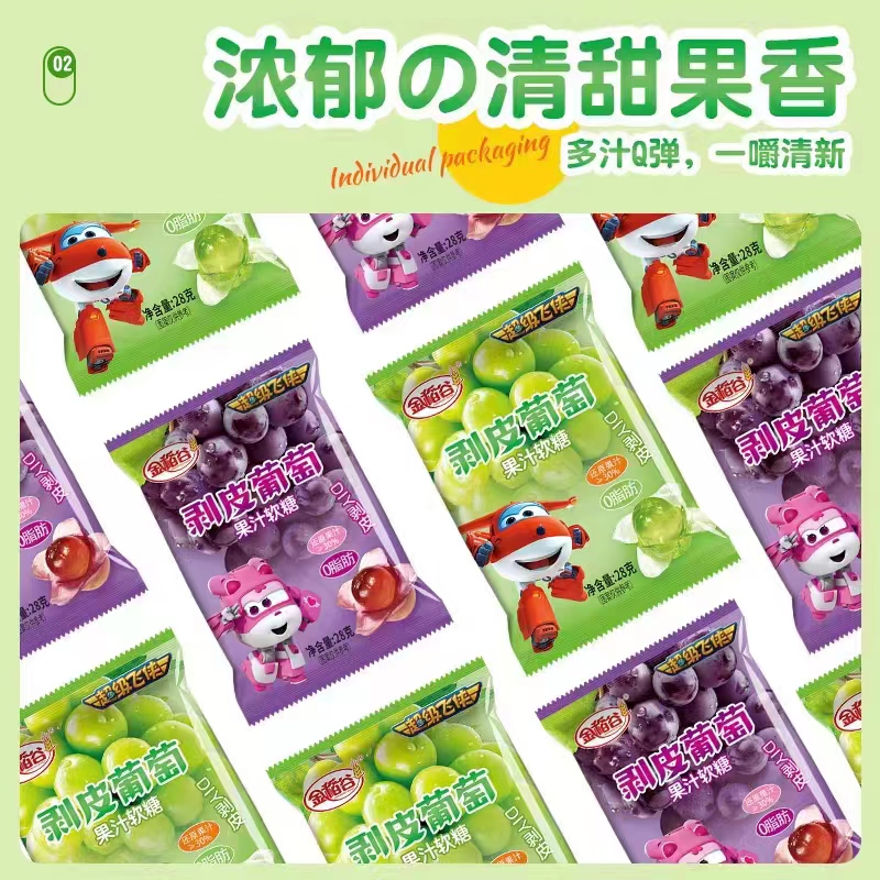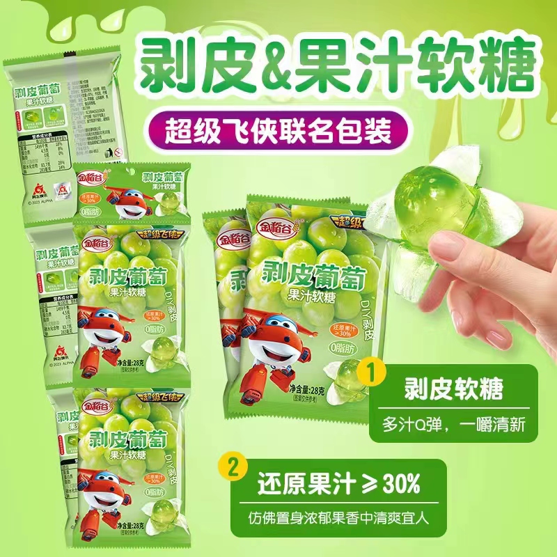 金稻谷品牌新品推出——可以剥皮的葡萄软糖,DIY果汁软糖,3种水果口味、包装,新奇玩法剥皮体验,超过30%果汁添加,软糯弹牙,果味浓郁,独立包装方便携带。