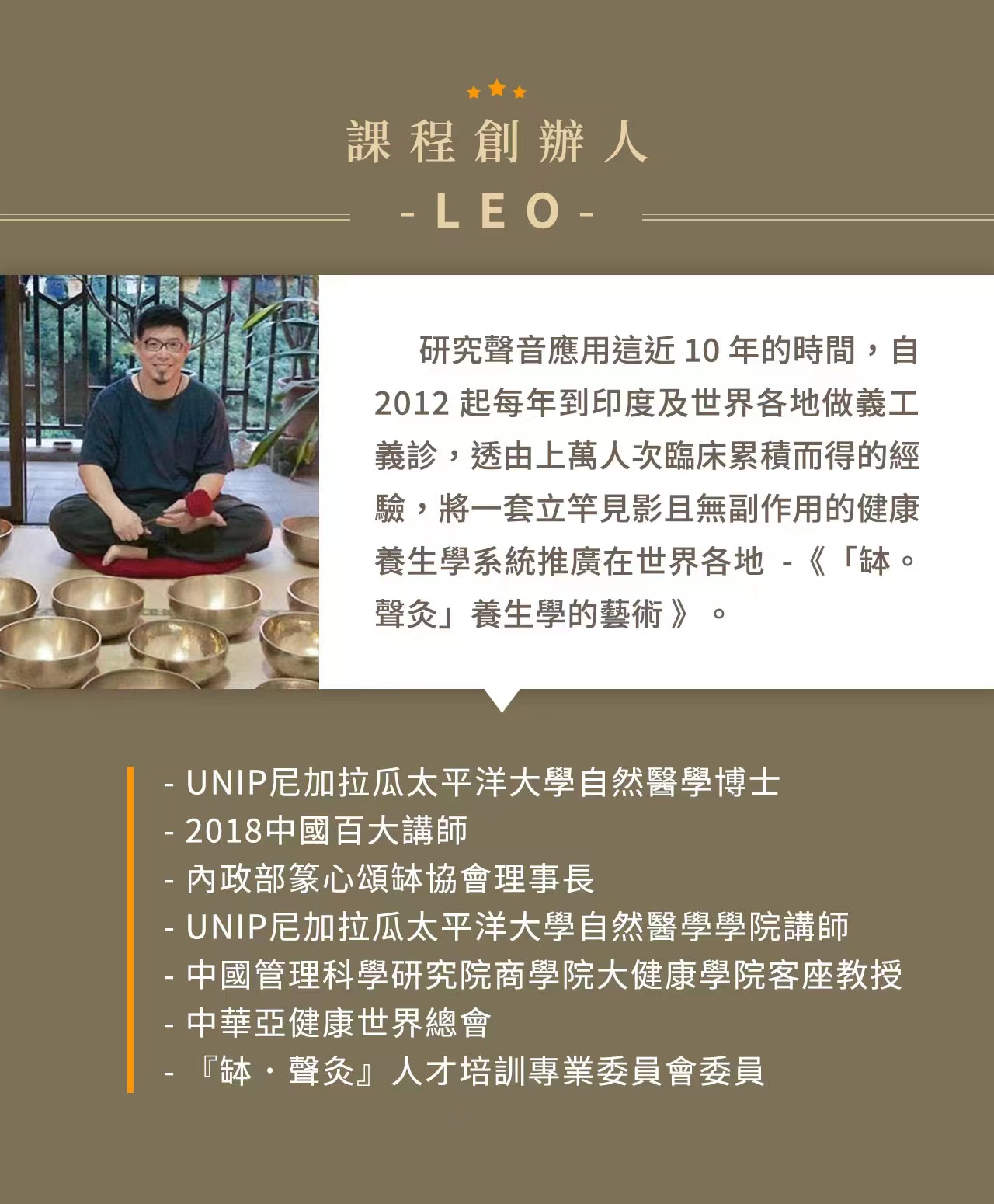 【钵·声灸Sound-Penetrate】疗育系统创办人;美国自然医学医师;国立台北艺术大学美术系油画组;国立台北大学国际财务金融研究所;UNIP尼加拉瓜太平洋大学自然医学博士;