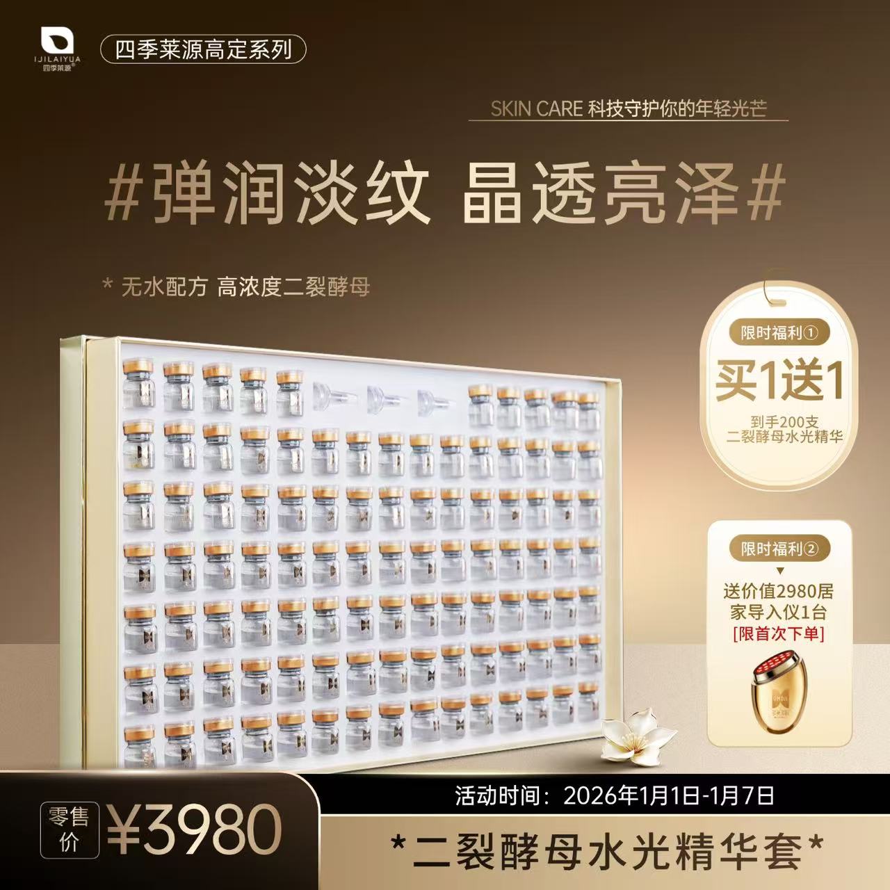 产品核心优势在于科学分阶抗衰设计,以3%四季水(打底焕亮)→5%二裂酵母水光(肌底支撑)→10%胶原蛋白套(锁龄塑廓)的胶原能量梯度,逐层叠加抗衰效能,让肌肤从根源焕发年轻活力,实现由内而外的逆龄蜕变。