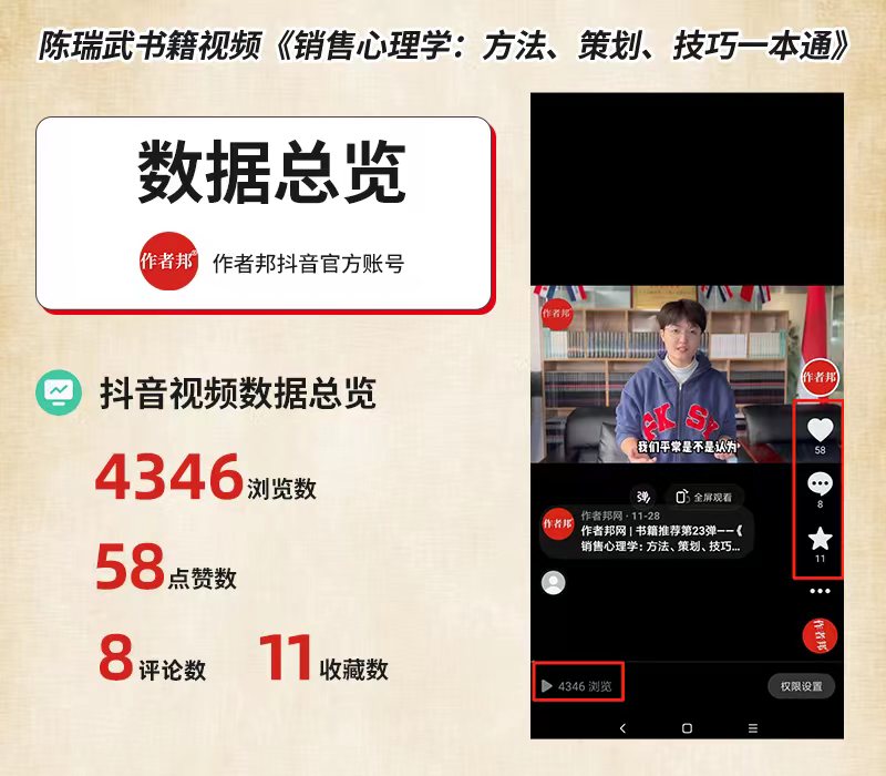 近日,陈瑞武老师的书籍推荐视频《销售心理学:方法、策划、技巧一本通》,上线做作者邦网抖音官方账号等渠道,收获了破4000次浏览、获赞58次的好成绩。日前,数据还在持续提升当中。