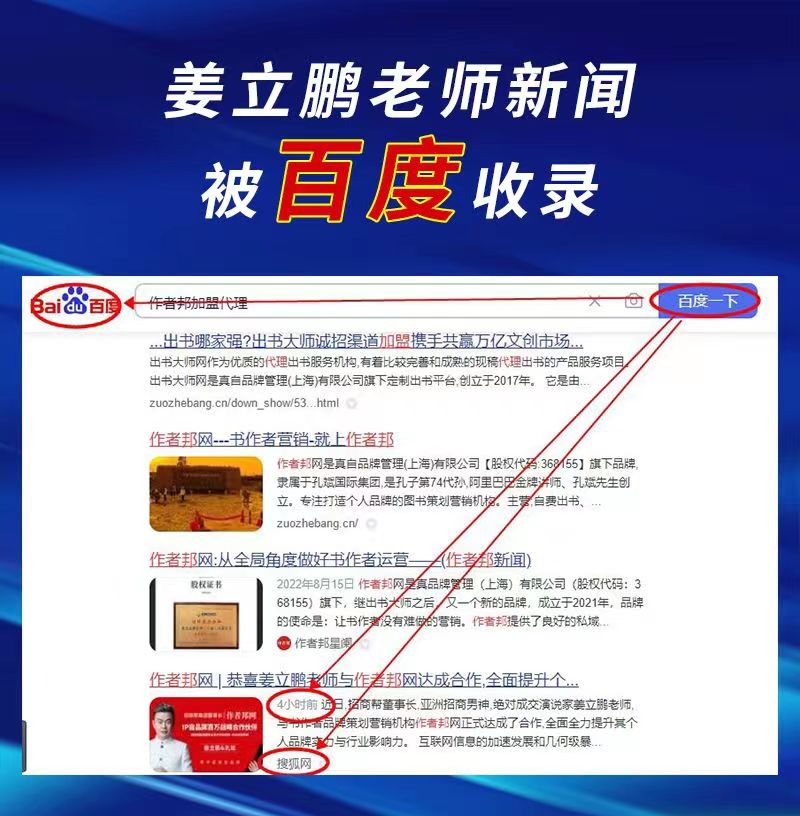 近日,作者邦网为书作者姜立鹏老师撰写的品牌策划文章于各大平台进行推广宣传,短时间内便迅速被百度、天眼查等权威媒介所收录。有效地提升了作者邦网与书作者的知名度与影响力等,并共同创造了有利的多方共赢局面。