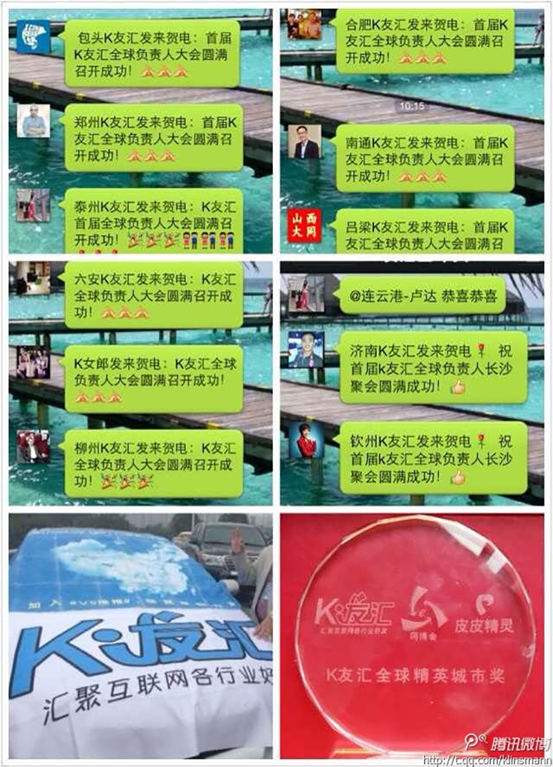 K友汇的发起人老K 管鹏先生首先就K友汇的由来给大家做了介绍,K友汇成立于9月3日,当时是老K的个人好友群,因为其本人有过万微信好友,希望可以把好友资源和更多的K友分享,所以创建了这个聚合人脉的平台。K友汇定位于打造社交平台上开放、分享、聚合、人脉的生态圈,目前已经创建有15个K友汇总群和一个已经过300人以上的微米大群。K友汇的品牌总顾问杨运良作为国内知名的品牌策划专家,把K友汇比喻成一棵苍天大树,每位K友就是树上面的一片叶子,树干就是全球各地的组织,树根就是各地的线下活动,福利就是树上面结的硕果。这种形象的比喻让大家倍感亲切,得到了在场各位的广泛的认可。杨运良还倡议发起了K友汇的品牌部门,增设马佳彬、志龙、灰太狼为品牌部的成员。K友汇目前在全球化的高速发展过程中,也已经不断的衍生多子品牌的成长,比如定位爱好微信、微博的美女K女郎,由美腿团出任团长。意向和腾讯公益深入合作积极落实参与各种公益活动的公益组织-K公益由魔王出任负责人。为了解决福利发放问题,正式推出专门发放特惠产品、赠送礼品的福利平台K友惠(微信号:kuh889)由iskyshop团队倾情打造。微盒之父、北京邮电大学3G学院董事长范金鹏先生还主动发起成立了聚合大学生人脉关系、扶持大学生创业的K学团,并在长沙的北邮3G学院湖南分院进行了首次的K学团成立大会,由杨天放出任秘书长。