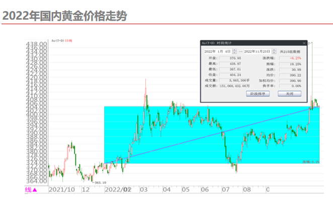 “年初至今,人民币金价约上涨了8%。”北京黄金经济发展研究中心研究员、CCTV财经频道嘉宾田密在11月25日举办的2022黄金珠宝产业(长春)高峰论坛上作了《波动下的黄金投资策略》主题演讲。他认为,面对通胀高企、汇率波动、“灰犀牛”和“黑天鹅”事件扰动市场等因素,在资产中配置黄金对冲风险是不错的选择;同时看涨黄金长期价格。黄金作为一种特殊的大宗商品,具有商品属性、货币属性和投资避险属性。其中投资避险属性是在商品属性和货币属性的基础之上衍生、发展而来的。而正是由于黄金兼具多种属性,使得黄金的价格决定因素比普通商品更为复杂,不仅受到供求关系的影响,同时全球货币体系变化、货币政策变动、投资需求、国际经济金融形势等都是重要的影响因素。