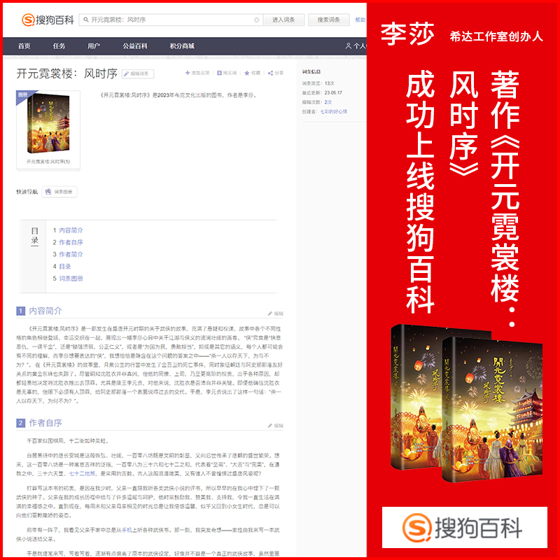 近日,由布克文化出版、李莎老师创作的新书《开元霓裳楼:风时序》,正式上线百度百科、搜狗百科、知乎以及豆瓣等平台,诠释其独特而富有魅力的品牌实力。