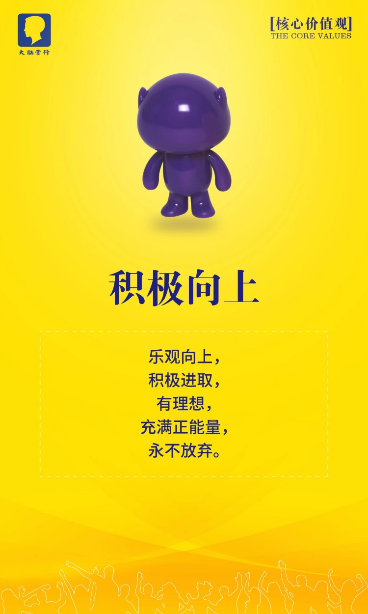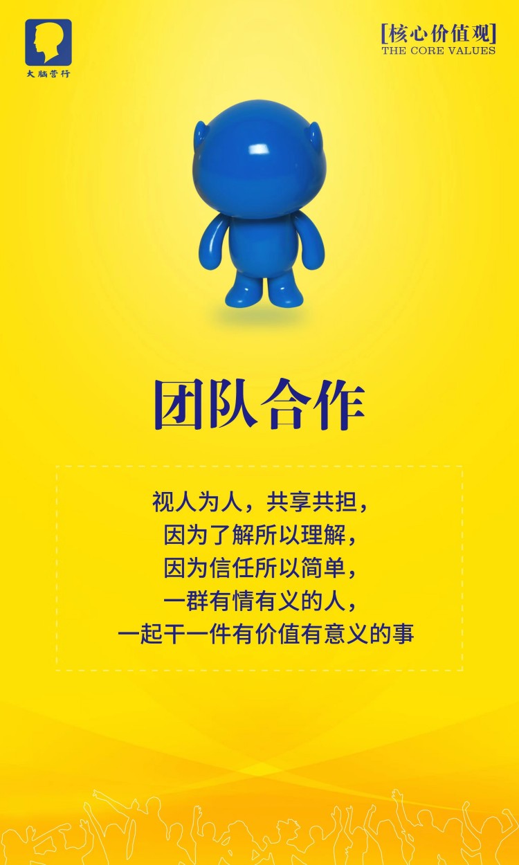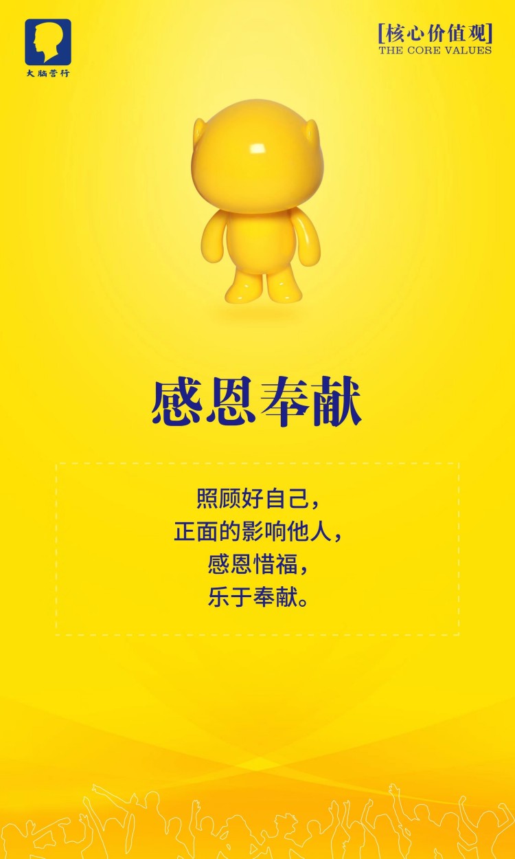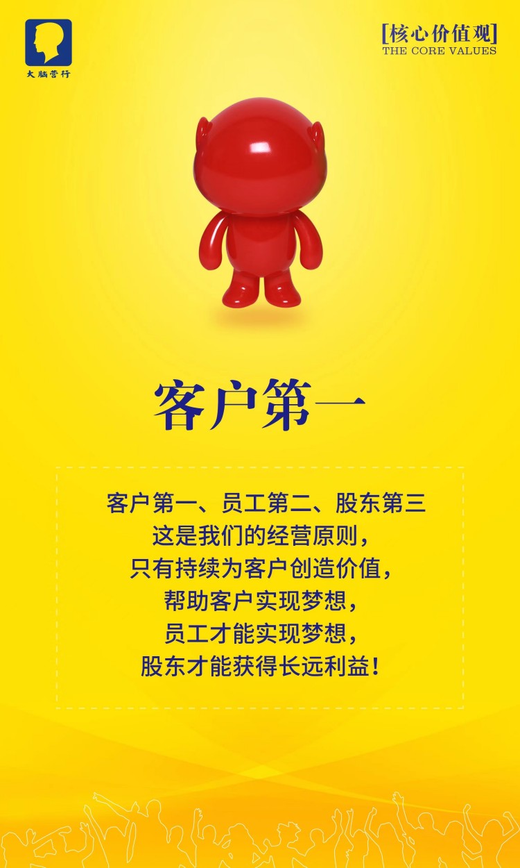 大脑营行的理想是用正正经经赚到的钱回馈员工,让大脑营行成为业内受人尊敬的公司。我们的理想是用正正经经赚到的钱做更多的研发,创造更好的产品,为客户提供更好的服务。一流的销售水平是我们赚钱的根本,一流的产品和服务是我们的命根。我们不会为了钱而不要命,因为我们有自己的灵魂:我们要实现客户,员工和公司的三赢。