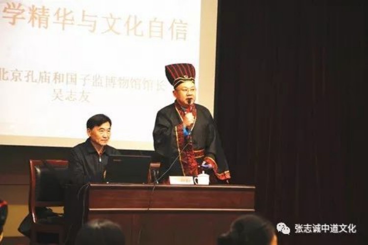 新时期的祭孔,是为了在缅怀先圣先贤的同时,将中国优秀的礼乐文化进行传承、弘扬,进而提高民族素质、增强民族自信、振奋民族精神、造福人类社会、推动社会进步。随着祭孔的礼成,张志诚老师邀请到 北京孔庙和北京国子监博物馆馆长吴志友教授分享《儒家精华和文化自信》。