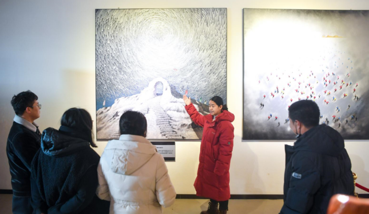 游客在西部影城美术馆内驻足观展。艺术馆于今年内建成,现藏展品70余件,涵盖油画、雕塑、手办等多个艺术领域。