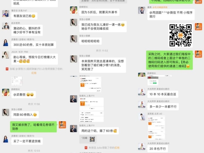这时的我,一心想着更改调价的事情,已经顾不上别的。这是群里,我们DISC+社群的总馆长,又正如她的外号【及时雨】一样,在群里冒泡了,她说,此时5.5折的话售价是31.9元一本,十本319元,但是刚好可以够使用平台300-60的优惠券;如果价格调到了5折,则是29元,买十本还不够300-60的优惠。莫不如此时下手,别一会优惠券又被抢光了,买的反而更贵。