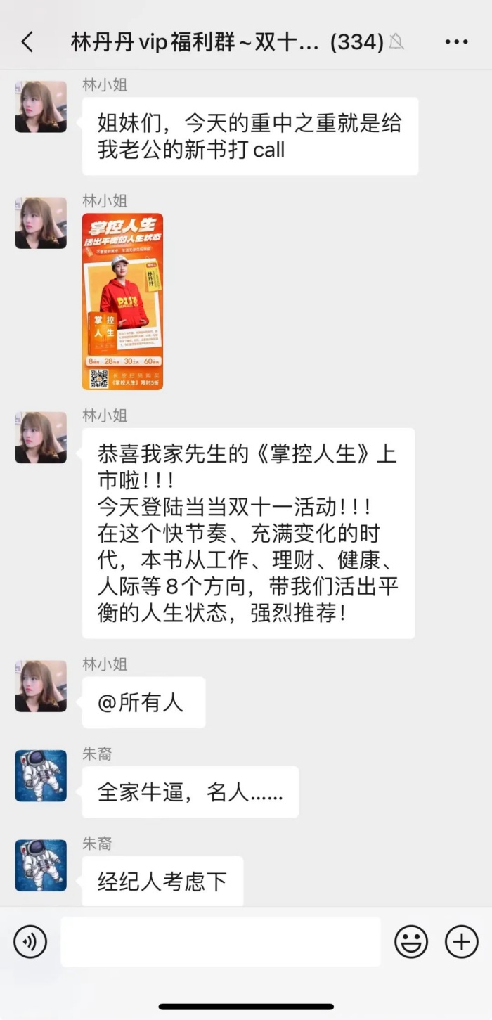 为了推广图书,我也是想尽了各种办法,比如我太太有个私域群,里面全是平时跟我太太买这买那的一群小伙伴,我太太在这个群里会帮助大家全球采购各种物品,但是我想,这个群里让大家买书,无论如何,这都是第一次,下午太太忙好家里的事情,我就要邀请她在她的【买买买群】帮我推广图书,于是一群女同胞,也有不少纷纷下单支持,这或许也是挺不错的送给家里另一半的双十一礼物,哈。