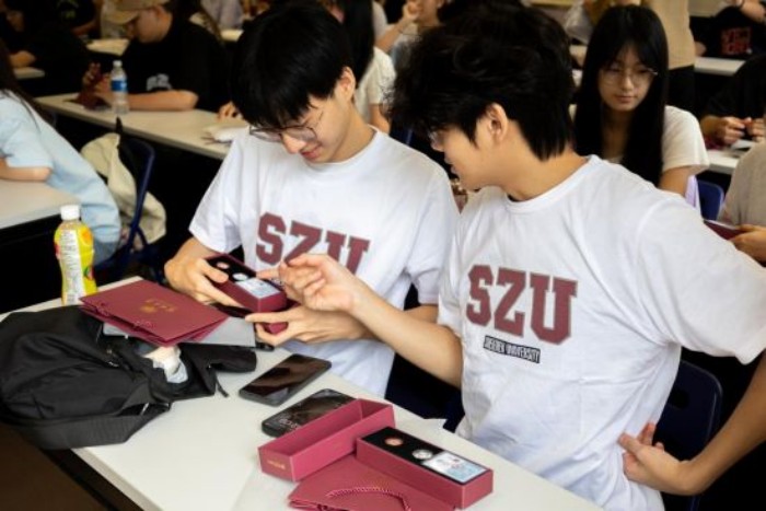 深圳大学代表团还为香港学院学生赠送了校徽和校园文化衫。新生代表李嘉晟在发言中表示,作为深圳大学香港学院的第一届本科生,他深感自豪。深圳大学建立香港学院是为香港青年提供优质高等教育资源的一次全新探索,既是时代的机遇,也是香港青年成长与发展的新起点。他希望通过四年的学习不断提升综合能力,掌握扎实的学术知识,习得丰富的实践技能,与同学们携手并进,用“千磨万击还坚劲”的精神砥砺前行、探求真理,不忘初心、追逐梦想。