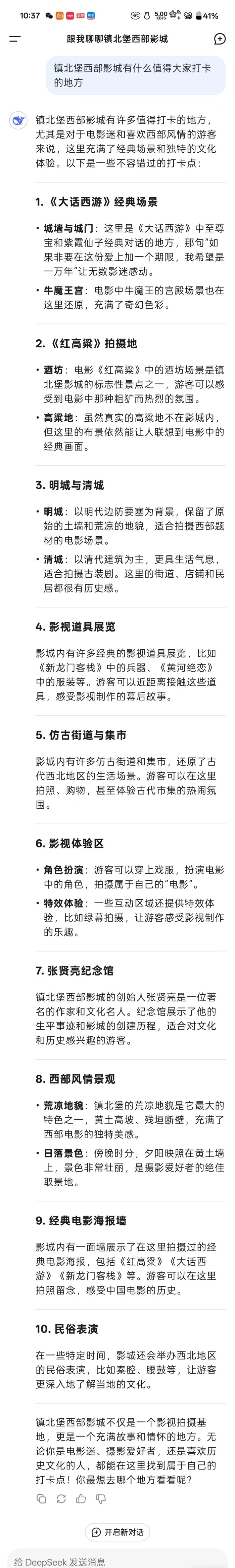 春节期间,中国AI——DeepSeek突然火爆全网,引发高度关注,被网友称为“神秘东方力量”,那么今天我们和“DeepSeek”聊聊镇北堡西部影城.。