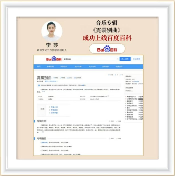 近日,独立音乐人李莎女士精心打造的音乐专辑《霓裳别曲》成功上线百度百科,引发了广泛关注。这张专辑是为其创作的《开元霓裳楼》系列小说量身定制,不仅展现了李莎在音乐创作上的深厚功底,更是文学与音乐完美交融的典范。