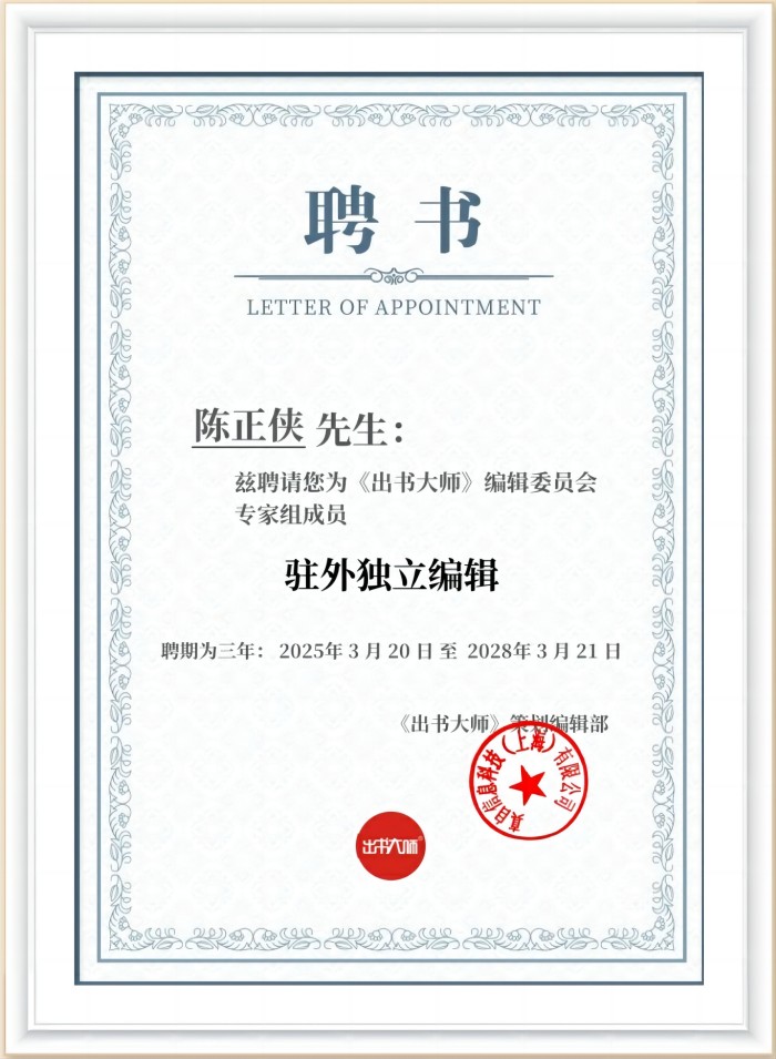 这一聘书的颁发,不仅标志着陈正侠老师正式成为出书大师编辑委员会的一员,更体现了出书大师对资深编辑人才的尊重和重视。 陈正侠老师在接受聘书后发表了感言。他首先对出书大师的信任和邀请表示了衷心的感谢,并表示将不负众望,积极履行编辑委员会专家组成员的职责,为出书大师的发展贡献自己的力量。