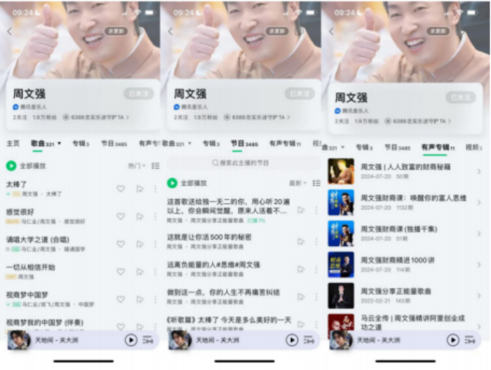 如果你有仔细看上面这张图,你会惊奇地发现:周文强老师的主页,不仅有 歌,还有他的课程分享。据我所知,周文强老师有许多学员、合伙人,弟子,都 是先听到他的歌,再听他的课,然后才买了课,成为弟子的。