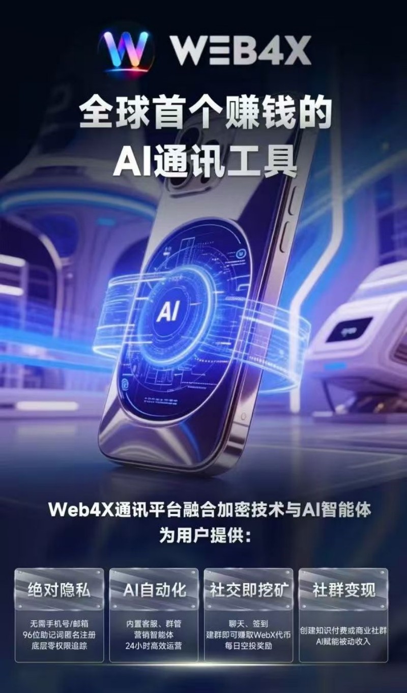 在信息洪流奔涌的时代,通讯工具始终是连接人与世界的关键纽带。从文字跳动的短信时代,到图文并茂的社交平台,再到如今万物互联的智能纪元,每一次通讯技术的迭代都深刻重塑着社交模式与商业格局。当AI浪潮席卷而来,传统通讯工具的局限日益凸显,一场从“即时沟通”到“智能交互”的变革势在必行。Web4X推出的AI加密通讯平台,正是这场变革的先锋,以创新技术为支点,撬动数字商业的全新未来。