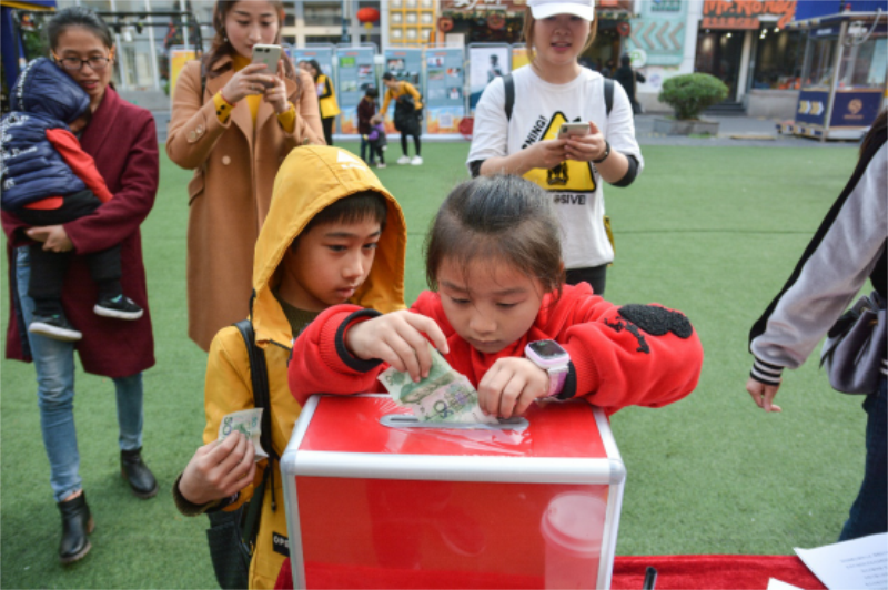(图)公益活动吸引众多未报名参加义卖的家长带孩子直接捐赠