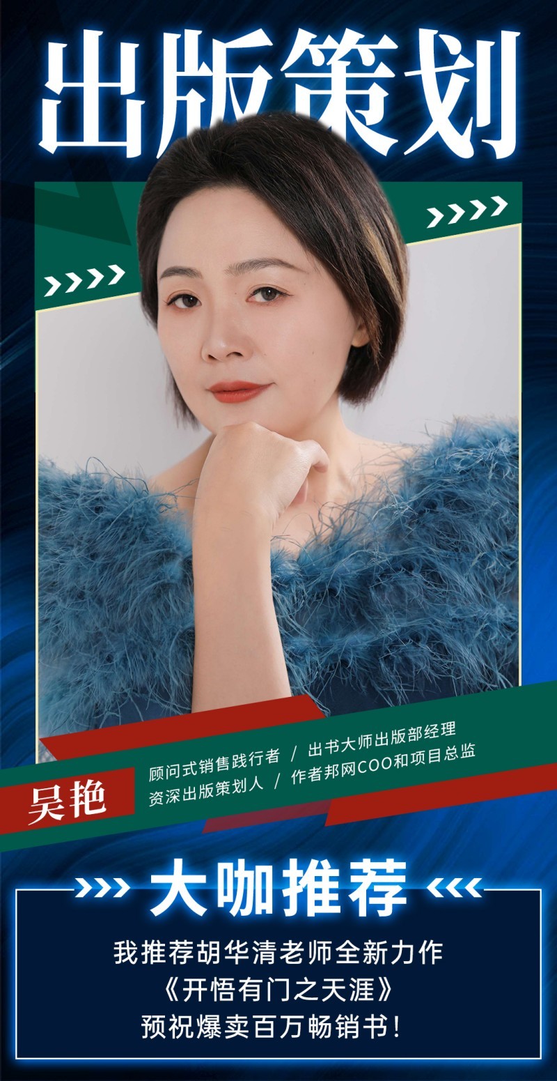 推荐人介绍:吴艳是顾问式销售践行者、作者邦网COO,深耕出版行业多年,为500+政企领袖策划出版上千本畅销书,合作200+出版社,覆盖新华书店、高铁机场等90%以上渠道。2017年,她成立的真自品牌管理(上海)有限公司仅用7个月时间就在深圳前海股权交易中心成功登录新四板,进入资本市场,深谙优质内容的市场价值。