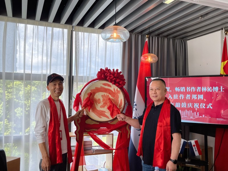 (作者邦网CEO孔斌与林沁博士共同击鼓庆祝林沁博士入驻平台6周年)