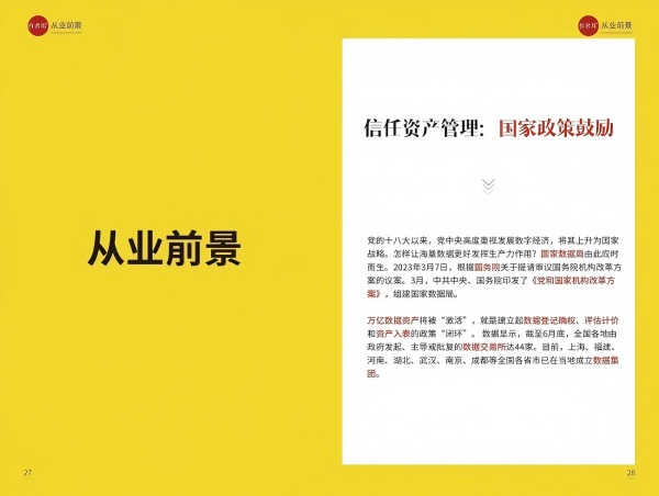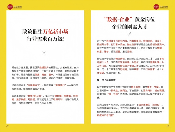 “数据是数字经济时代的关键生产要素,是国家基础性战略资源!”国家重磅政策为数据资产定调,万亿级市场大门轰然洞开。从内容平台到企业系统,从自媒体卖货到区块链确权,一场从“内容搬运”向“数据银行”的战略转型席卷全国——存的是用户行为,管的是信任资产,赚的是数据价值。企业纷纷觉醒:谁先掌握数据收集、存储、管理、应用的全链条能力,谁就能抢占新一轮发展的制高点。百万级数据资产管理人才缺口,正成为行业最紧迫的刚需!