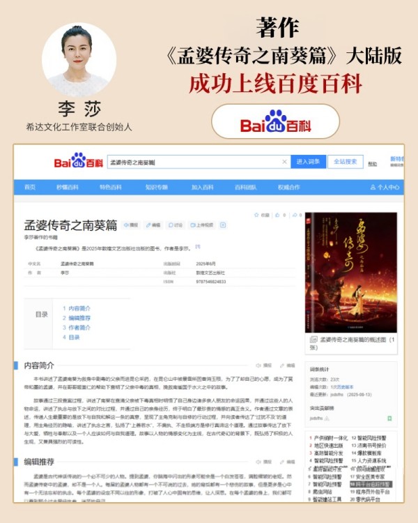 近日,李莎老师著作《孟婆传奇之南葵篇》大陆版正式登陆百度百科与豆瓣网。这一举措不仅为该书搭建了更广阔的传播桥梁,更让这份融合传统文化精髓与人生深度哲思的作品,得以通过两大主流平台,触达更多渴望心灵共鸣的读者。