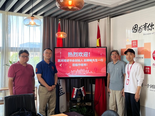 (作者邦CEO孔斌(右)与苏河湾读书会核心成员及理事赵达老师合影留念)