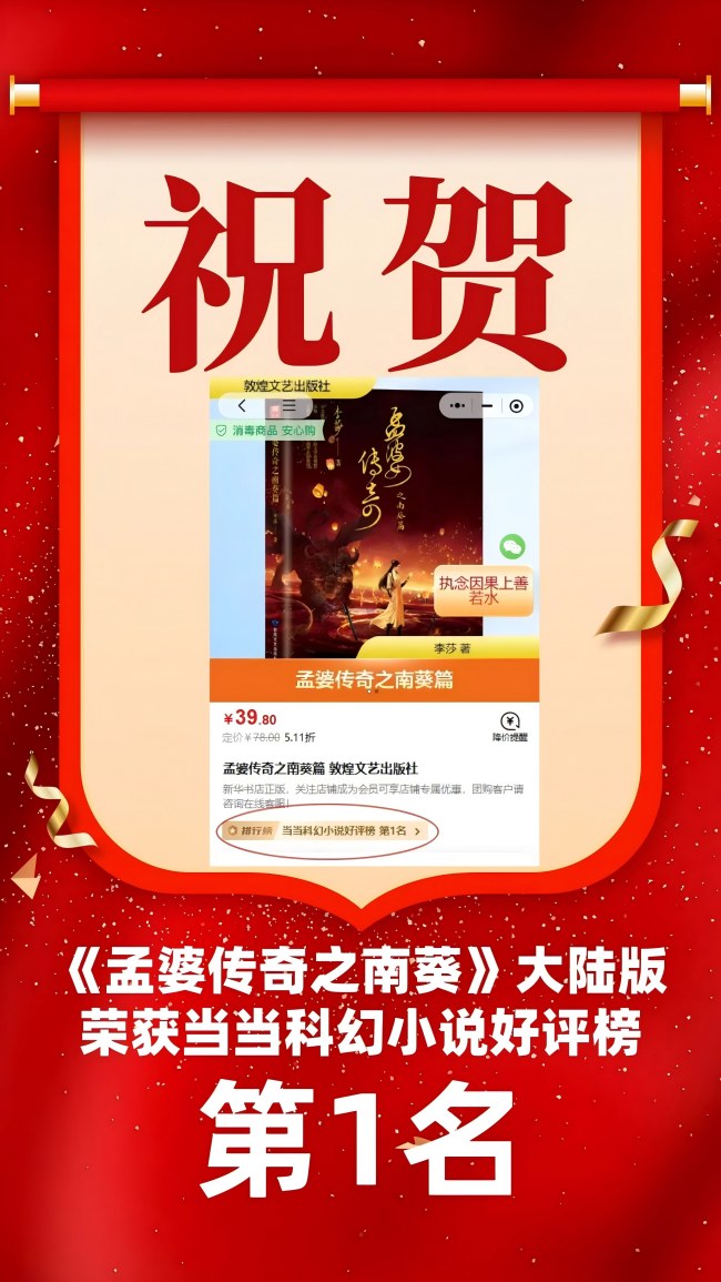 《孟婆传奇之南葵篇》上市后迅速获得市场认可,短时间内便冲上当当然科幻小说好评榜第一名。这已经不是李莎第一次获得市场成功。