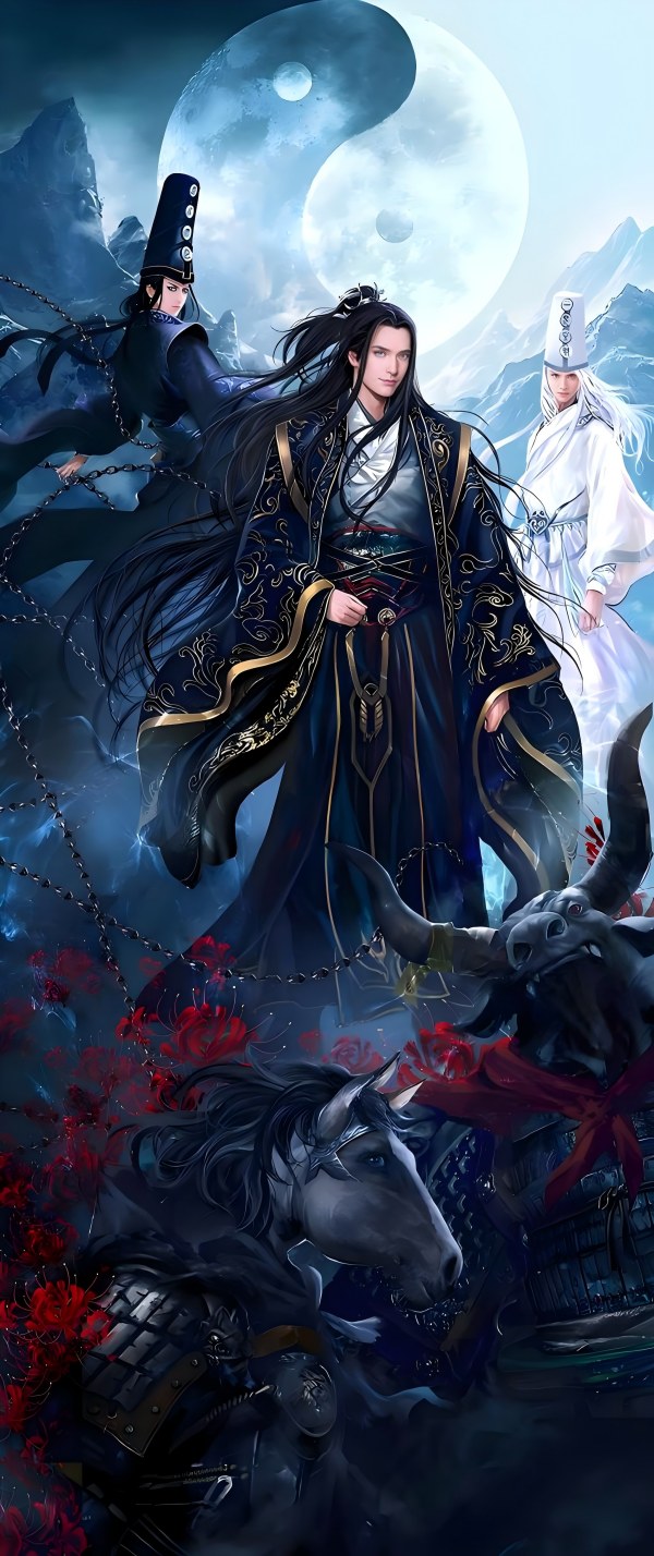 (书中冥界冥帝墨和与黑白无常、牛头马面形象插画)