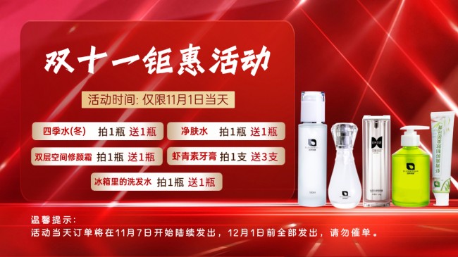 时光流转,双十一的号角再次吹响。这是一场购物者的狂欢,更是一次不容错过的护肤良机。四季莱源,始终致力于为您提供肌肤本源之美的护肤品牌,在此初冬时节,隆重推出“双11钜惠购”活动。我们深知,一次真正的肌肤焕新,远比无数次的盲目堆砌更为重要。因此,我们倾情奉上年度仅此一次的超级福利:11月1日当天,明星产品——净源透润净肤水,买一送一! 这不仅是一次价格的让利,更是一份对您肌肤健康越冬的郑重承诺。错过此刻,唯有再等一年!