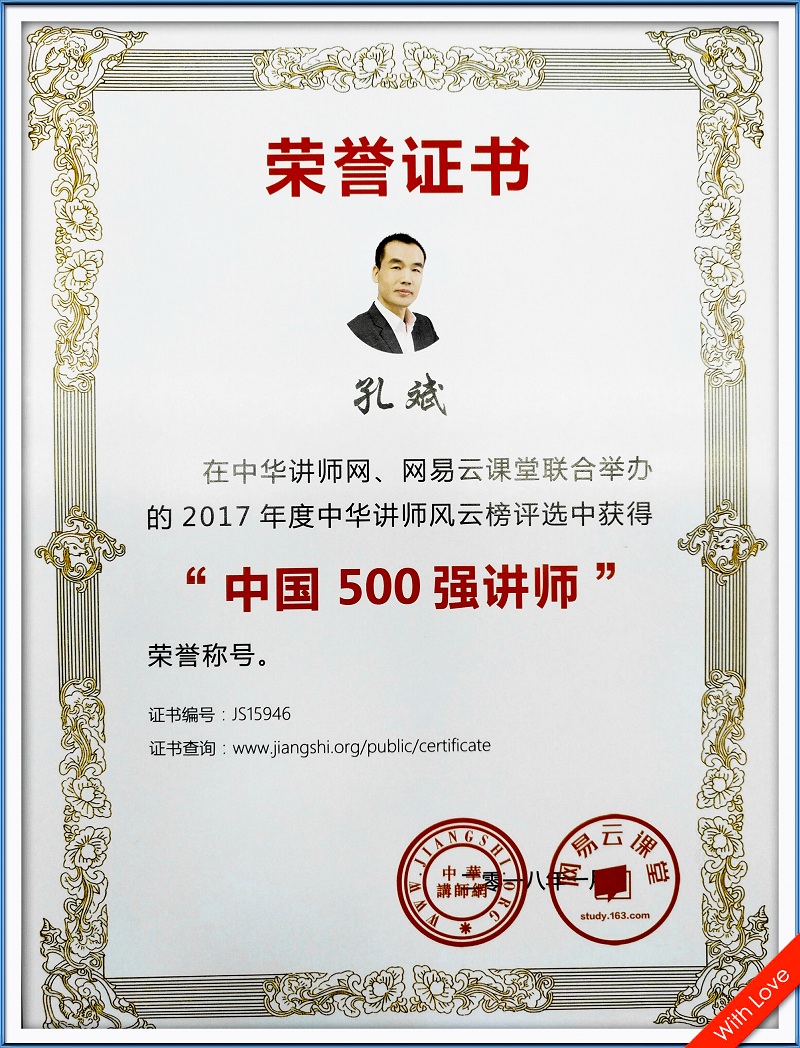 出书大师网最新消息:在中华讲师网、网易云课堂联合举办的2017年度中华讲师风云榜评选中孔斌先生获得“中国500强讲师”荣誉称号。在此向孔斌老师表示热烈的祝贺。