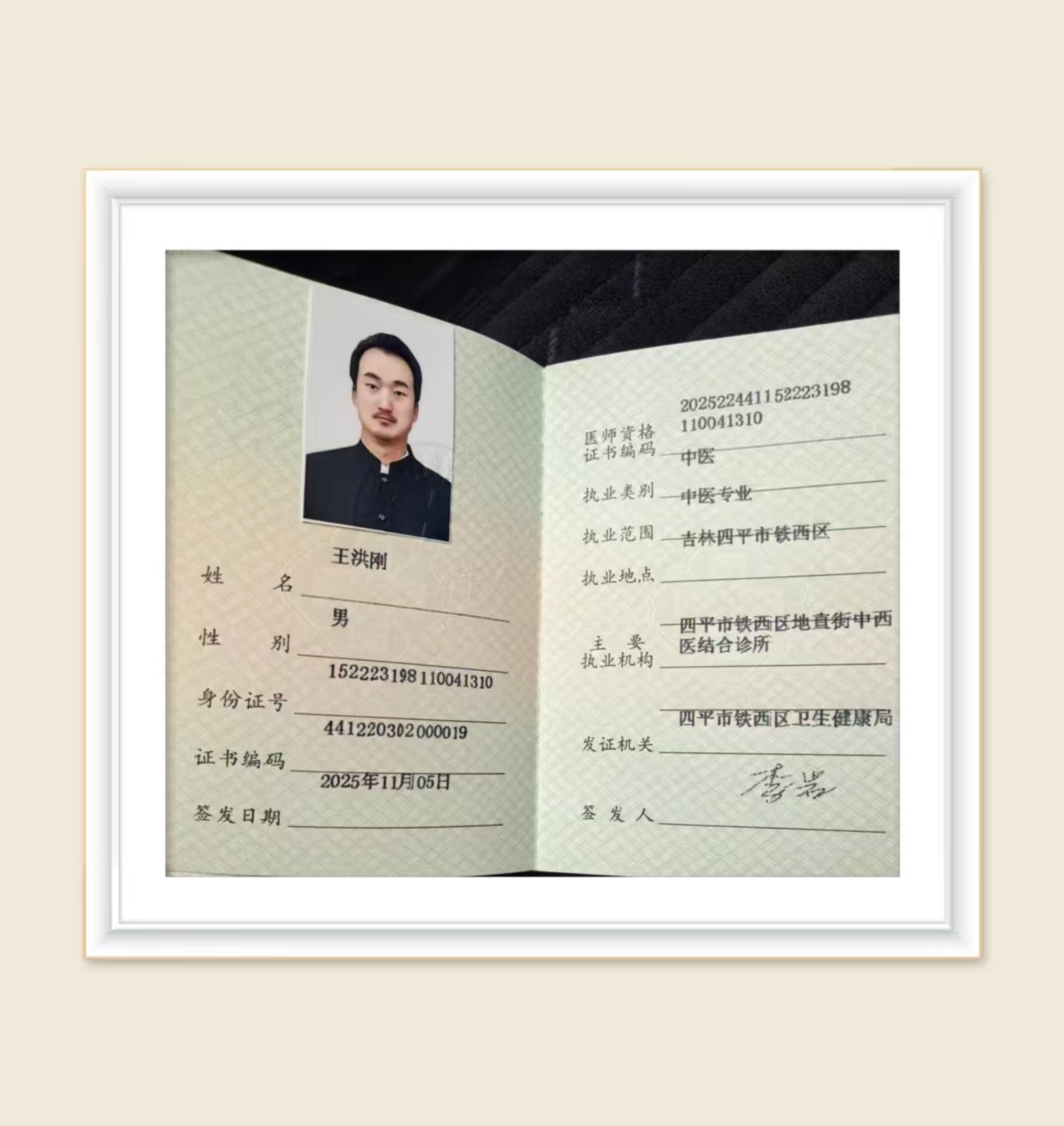 近日,王洪刚老师正式获颁由四平市铁西区卫生健康局签发的《医师执业证书》,签发日期定格在 2025 年 11 月 5 日,证书编码、医师资格编码等信息清晰完备,对应其在四平市铁西区地直街中西医结合诊所的执业岗位 —— 这标志着他的中医诊疗工作,从此步入合规、专业的新阶段。