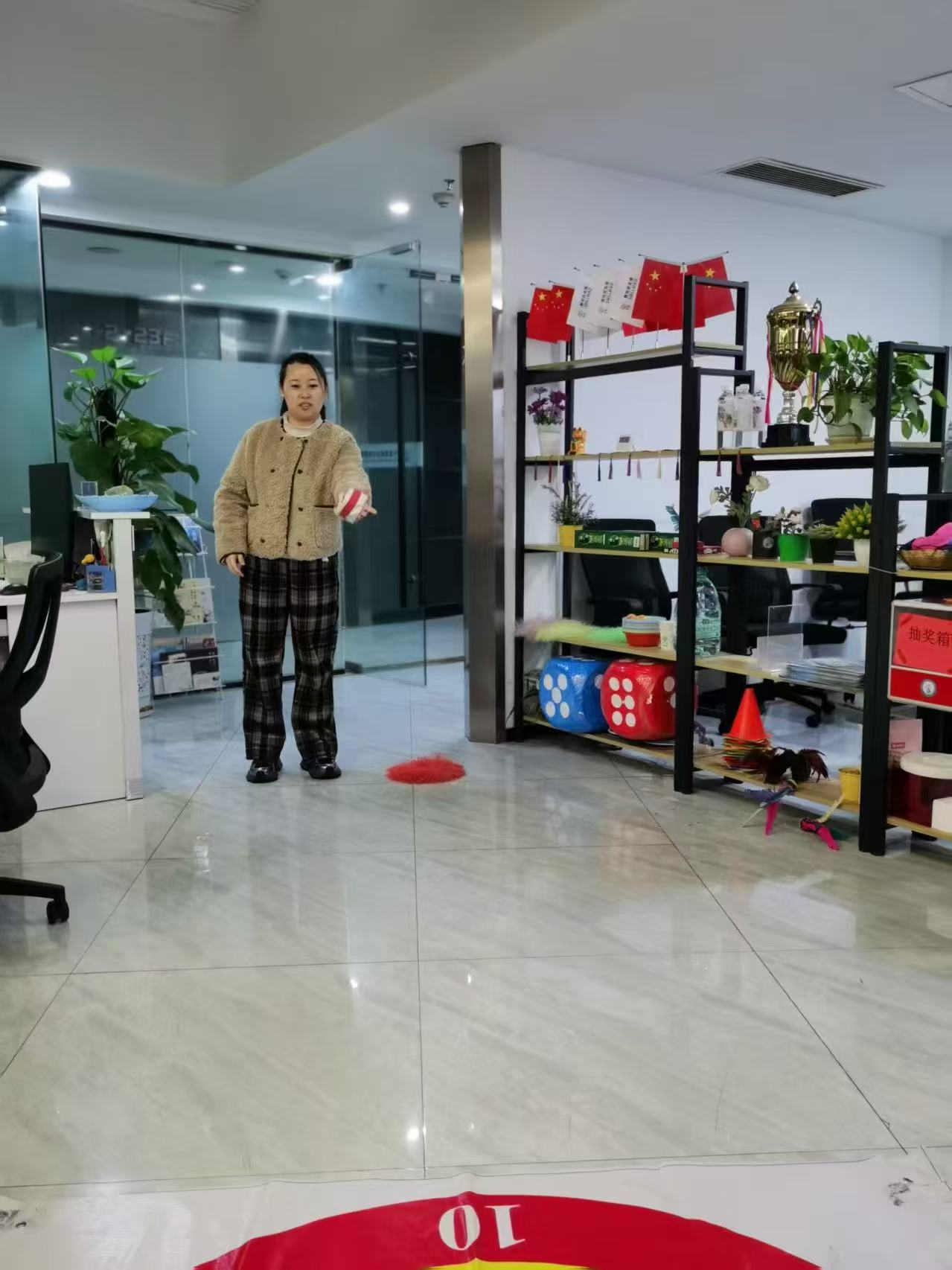 平日里堆满文件的桌子被腾开,有人蹲在地上整理投掷道具,嘴角藏着笑意;有人靠在椅背上刷活动预告,和同事小声打趣;抱着礼品托盘的姑娘来回走动,托盘上的小礼品碰撞出声。玻璃隔断后的会议室还亮着灯,但此刻的办公区,已成了没有层级、没有压力的天地——紧绷的肩膀放松,严肃的神情被笑容取代,原来职场卸下铠甲后,藏着这么多模样。