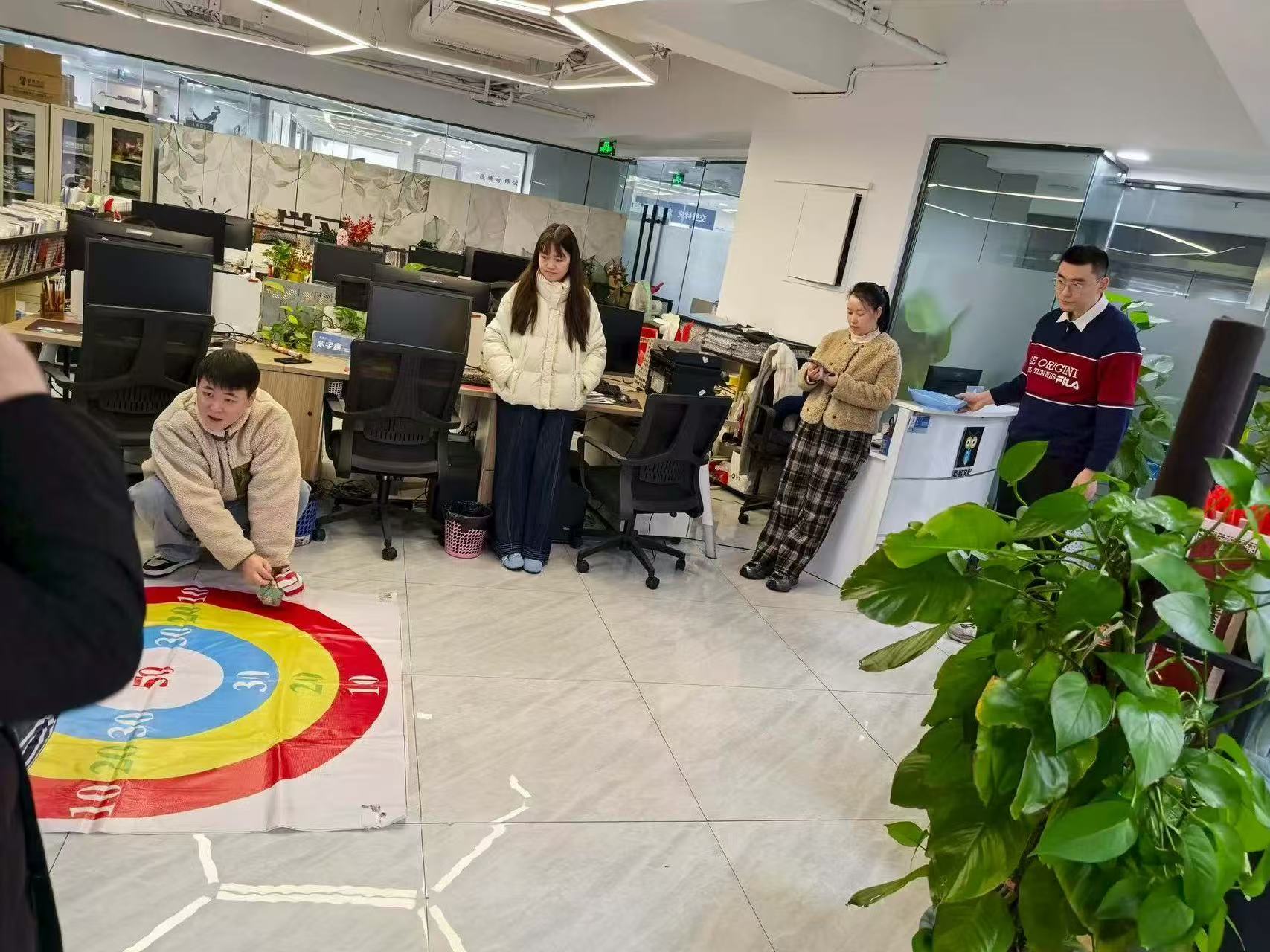 蹲在地上调试投掷垫的是项目主管;站在红线后投壶的是实习生;靠墙鼓掌的是财务大姐——这场活动里,所有岗位标签都被卸下。大家笑着、闹着,为彼此成功欢呼,为失误打趣,眼里闪着光芒。原来职场里,我们不止是同事,更是伙伴;抛开身份束缚,人与人的相处可以很简单、很温暖。