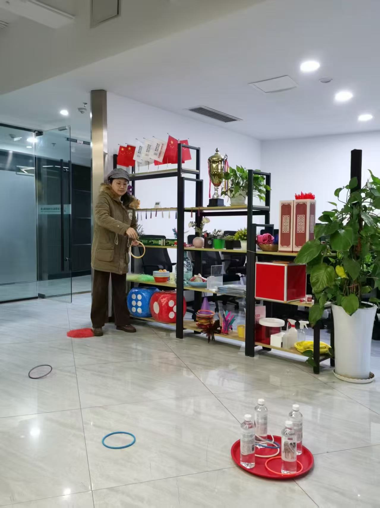 货架旁的地面上,彩色套圈划出弧线,有的落在奖品旁,引来一阵哄笑;有的精准套中水杯,周围立刻响起夸赞。有人凑在一旁支招:“再往左点,慢点儿扔”;有人主动帮套中奖品的同事递送,指尖相触时的一句“恭喜”格外暖心。原来职场温情从不在寒暄里,而在这慢悠悠的套圈时光中——一句提醒、一次帮忙,就足以拉近距离,让团队暖意流淌。