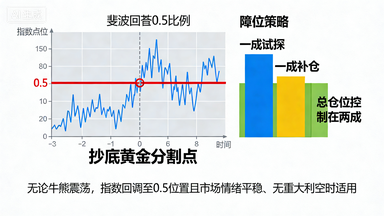 斐波那契0.5比例被誉为抄底“黄金分割点”,支撑与压力均衡,适配多数震荡市,是适用性最广的比例。何青平建议,无论牛熊震荡,指数回调至0.5位置且市场情绪平稳、无重大利空时,可采用“一成试探+一成补仓”策略,总仓位控制在两成。该位置信号明确,跌破则果断止损,站稳反弹可加仓至三成,实现收益与风险平衡。