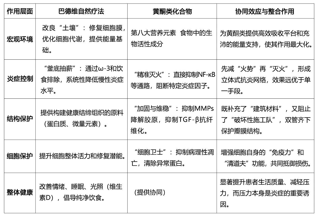 不同于传统食养的盲目进补,他立足“先调环境、再做精准干预”的核心思路,创新性提出巴德维疗法与黄酮类化合物的协同逻辑,既破解了单一疗法的局限,也体现了其严谨的辩证思维与精准的问题把控能力。