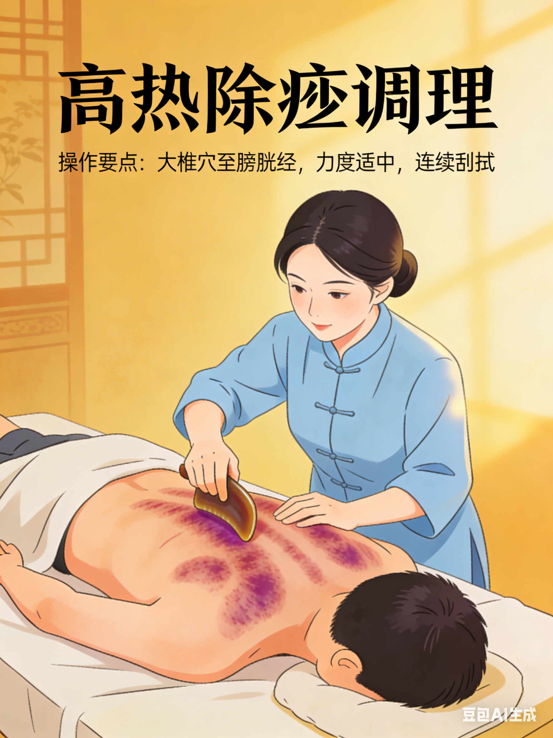 发热时,除痧可作为辅助降温方法。重点拍打曲池穴(肘横纹外侧端)与大椎穴(第七颈椎下),这些穴位有助于疏散风热。