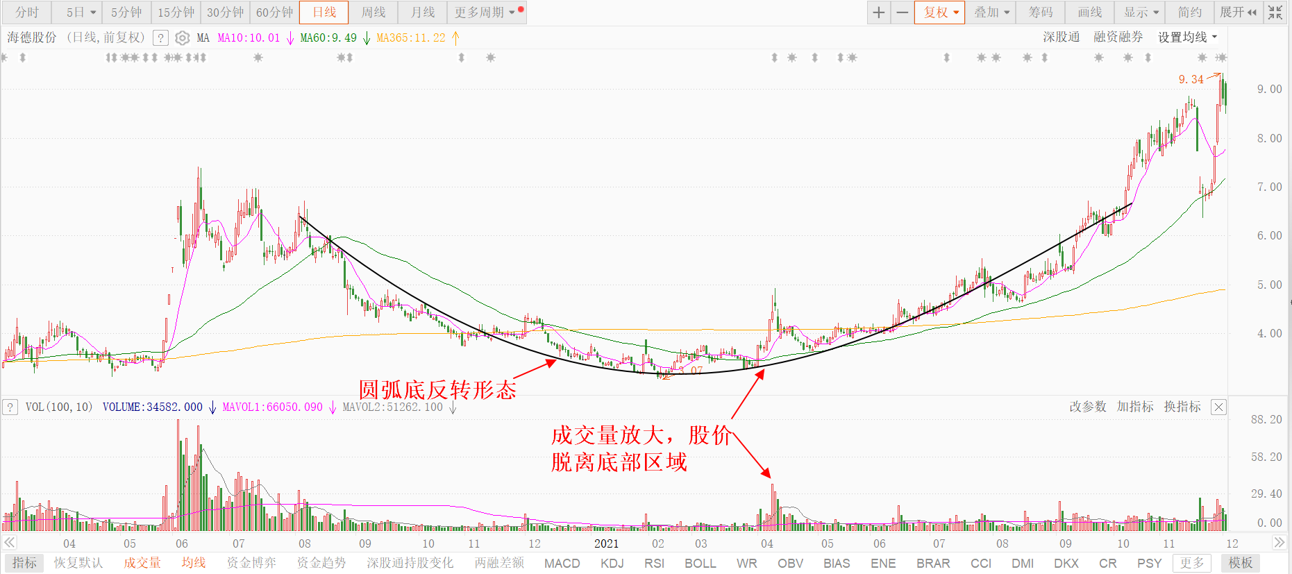 书中归纳了三种典型的底部形态:超跌底、熊市圆弧底和趋势线上方底。超跌底出现在股价快速下跌后,成交量极度萎缩,随后放量反弹;圆弧底则多出现在熊市末期,价格缓慢筑底,成交量温和放大;趋势线上方底则是股价沿上升趋势线运行,首次回踩趋势线时形成的买入点。这三种形态各具代表性,是识别底部的重要参考。