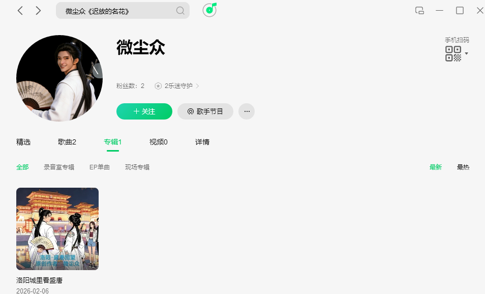 此次《迟放的名花》单曲随专辑《洛阳城里看盛唐》同步登陆QQ音乐,既是微尘众对主流音乐平台的信任,更是小众国风音乐走向大众视野的重要契机。作为国内头部音乐平台,QQ音乐汇聚了海量国风乐迷与音乐爱好者,既为独立音乐人提供了优质的展示舞台,也让这份兼具千年洛城底蕴与当代情感的作品,被更多人听见,让盛唐的诗意借旋律传遍四海。