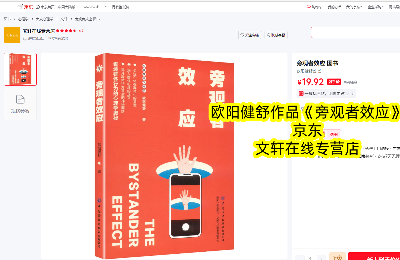 目前,欧阳健舒《旁观者效应》已在京东图书全网首发,官方正版现货直发,品质有保障、发货更快捷。这本书没有晦涩难懂的理论,只有贴近生活的分析与实用可行的方法,篇幅适中、阅读门槛低,通勤间隙、睡前时光就能轻松品读。