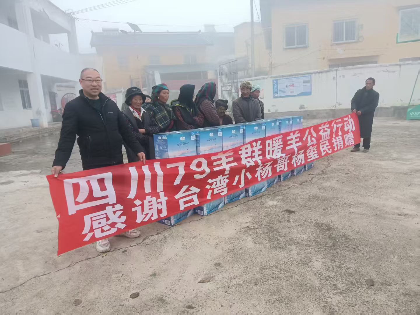 在若水镇的村落广场与爱曦小学的操场上,公益团队与当地干部共同完成了物资交接。老人们接过崭新的棉被,脸上露出了欣慰的笑容;孩子们捧着篮球、跳绳,眼中闪烁着雀跃的光芒。现场悬挂的“感谢台湾小杨哥杨玺民捐赠”横幅,成为了这场温暖传递的见证,也让善意的力量在人群中传递蔓延。