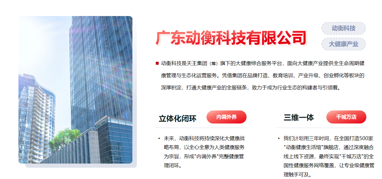 在这样的时代背景下,动衡科技应运而生。作为天王集团(筹)旗下的大健康综合服务平台,动衡科技打通品牌打造、教育培训、产业升级、创业孵化全链条,构建“内调外养”的完整健康管理闭环。未来三年,500家“动衡健康生活馆”旗舰店将落地全国,最终实现“千城万店”的网络覆盖,让专业健康管理触手可及。