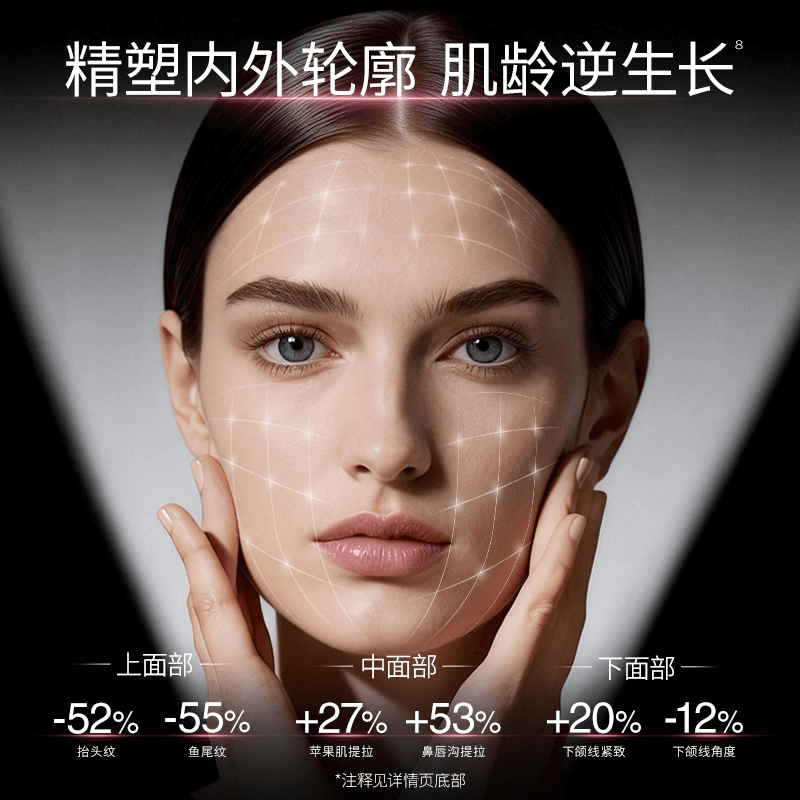 产品针对上面部、中面部、下面部定制化抗衰:上面部抬头纹、鱼尾纹分别减少52%、55%;中面部苹果肌提拉27%、鼻唇沟提拉53%;下面部下颌线紧致20%、角度优化12%,精准重塑立体轮廓。