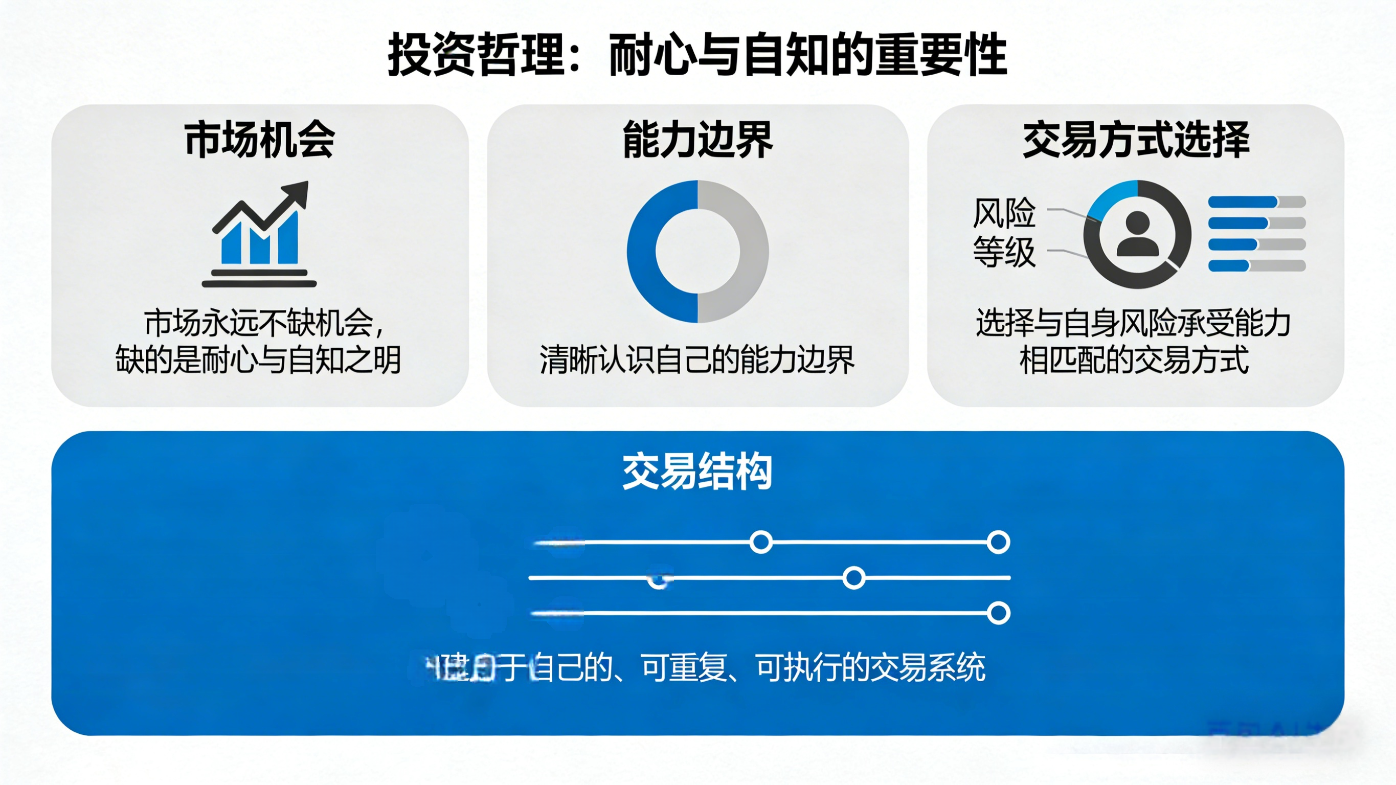 市场永远不缺机会,缺的是耐心与自知之明。每位投资者都应清晰认识自己的能力边界,选择与自身风险承受能力相匹配的交易方式。与其追逐所谓的“秘技”,不如脚踏实地,构建属于自己的、可重复、可执行的交易系统。