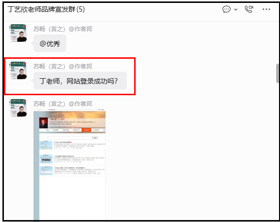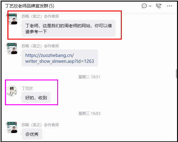 协作初期,信任资产规划师苏畅老师始终保持着细致的跟进节奏。他主动询问“网站登录成功吗?”,用温和的关切消除丁艺欣老师在陌生平台操作中的不安;在丁艺欣老师回应“好的,收到”后,及时给予肯定与鼓励,让她在品牌宣发的起步阶段感受到被重视、被支持,为后续深度协作奠定了温暖的信任基础。